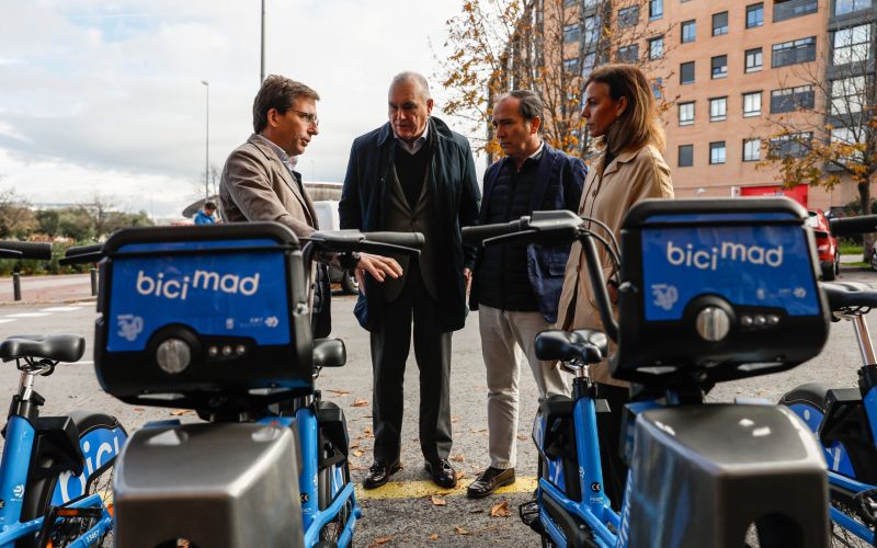 • El alcalde de Madrid, José Luis Martínez-Almeida, acompañado por el delegado de Urbanismo, Medio Ambiente y Movilidad, Borja Carabante, y el director gerente de la EMT, Alfonso Sánchez, han presentado la finalización de la implantación del nuevo bicimad.