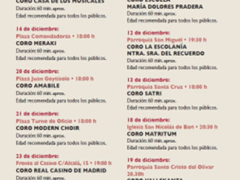 Las plazas del distrito se transforman en escenarios al aire libre donde la música se convierte en punto de encuentro vecinal disfrutando de la cultura con actuaciones. La tradición y la espiritualidad se unen en las parroquias e iglesias emblemáticas del distrito. Desde el 11 de diciembre al 3 de enero. Algunos de los escenarios son: plaza de la Corrala, plaza de las Comendadoras, plaza Juan Goytisolo, Parroquia de San Lorenzo, Parroquia San Miguel, y Parroquia Santa Cruz.