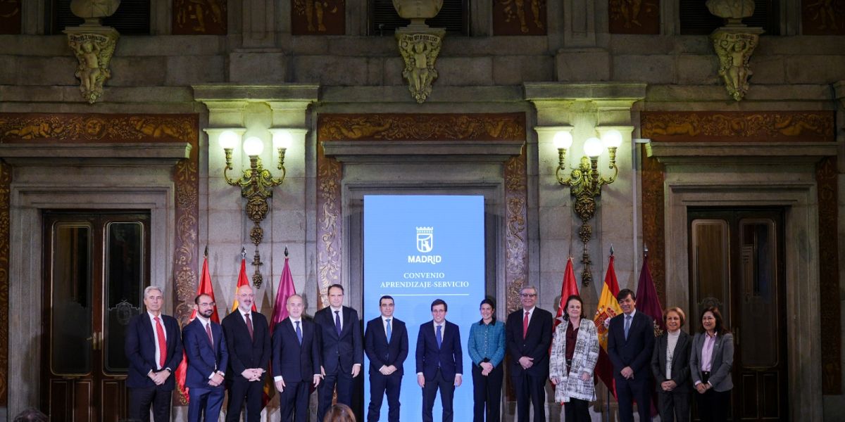 El alcalde de Madrid, José Luis Martínez‑Almeida, firmó con los rectores de 12 universidades, ocho públicas y cuatro privadas, un convenio de colaboración para el desarrollo de proyectos de aprendizaje-servicio en la ciudad, una metodología educativa que combina la formación académica del alumnado con la prestación de un servicio útil a la comunidad. El Ayuntamiento suscribió este acuerdo con las universidades de Alcalá, Autónoma de Madrid, Carlos III de Madrid, CEU San Pablo, Complutense de Madrid, Internacional Menéndez Pelayo, Nacional de Educación a Distancia, Nebrija, Politécnica de Madrid, Pontificia Comillas, Rey Juan Carlos y Villanueva.
