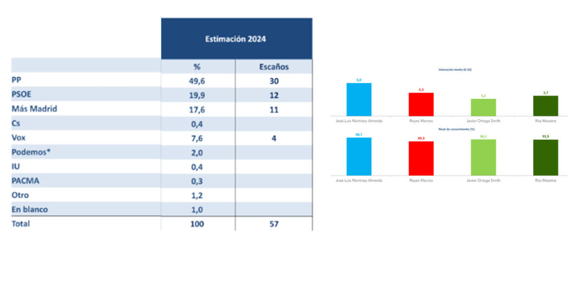 En cuanto a la valoración de los líderes municipales, José Luis Martínez-Almeida es el único que aprueba con una valoración de 6 puntos sobre 10. Reyes Maroto se sitúa en el 4,3 y Rita Maestre en el 3,7.